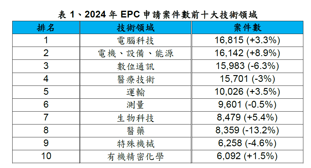 表1為2024年申請案件數最多的技術領域前10名排行榜,電腦科技領域第一次奪冠,電機、設備、能源領域則是案件數增加最多,在2023年位居第一的數位通訊領域,卻首次發生衰退,名次掉到第三。