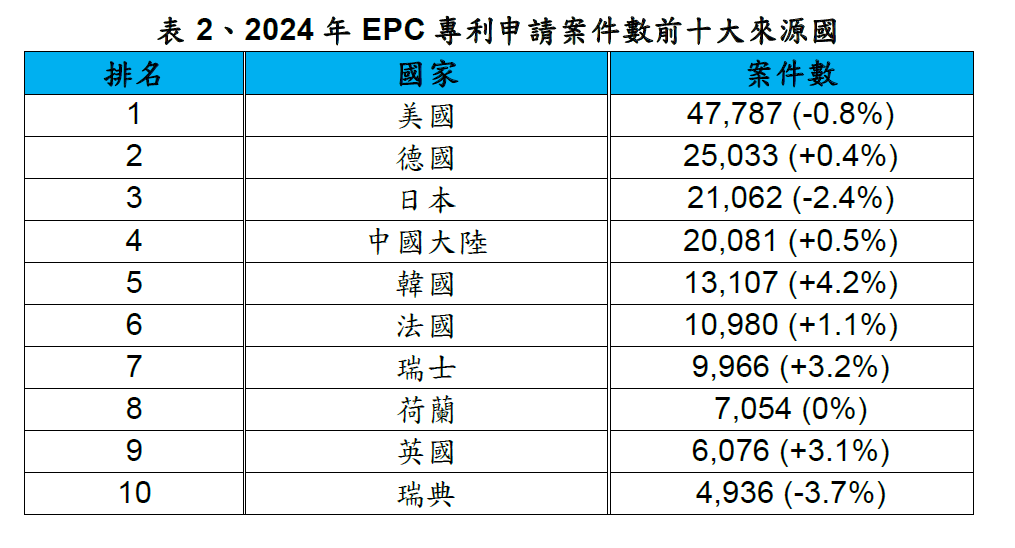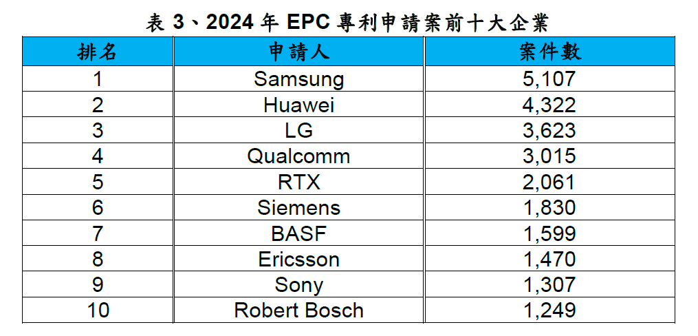 表3為2024年提出EPC專利申請案件數最多的企業前十名,涵蓋4家歐洲企業、2家韓國企業、2家美國企業、1家中國大陸企業及1家日本企業。