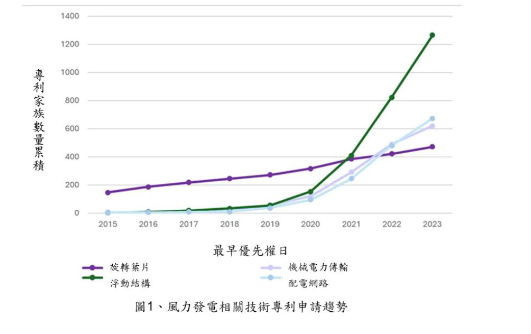 空氣動力學是風力發電的原理。風力發電機能將氣流的動能轉換為力學能,當空氣流過發電機的葉片,葉片兩側產生的壓力差會產生升力,進而使葉片旋轉,並且產生電力。風能的角色已經從古代的推動船以及輾穀,演變成為現代潔淨能源的基石。據統計,2024年的風力發電佔超過全球總電量8%,隨著科技的發展,預計發電量會持續提升。葉片設計、浮動結構以及發電機和控制系統則是專利申請中,常見的風力發電相關技術。根據圖1歐洲專利局的統計,浮動結構、機械動力傳輸以及配電網路的專利申請量呈現快速成長的趨勢;旋轉葉片的專利申請量則是穩定提升。