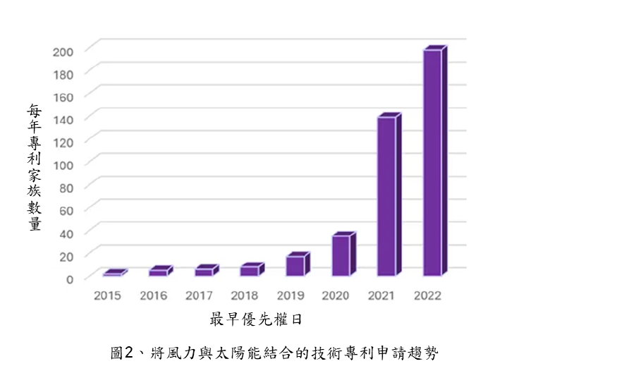 由於風力發電受限於氣流狀況,因此能源儲存以及結合其他發電系統亦是現今技術正在發展的方向。根據圖2歐洲專利局的統計,將風力與太陽能結合的發電技術專利申請數量自2018年起呈成長趨勢。