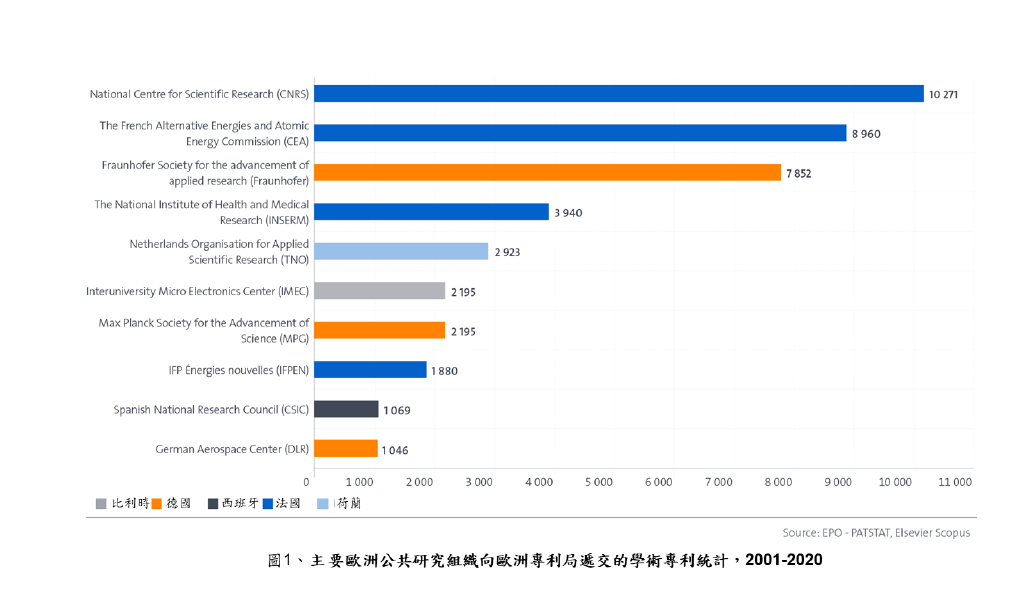 此份報告分析了250家PRO,發現這些機構在2001年至2020年之間,各自皆提交至少20件專利申請,其中有超過三分之二的PRO專利申請案來自最頂尖的16家機構,顯示PRO的專利活動集中在少數主要研究機構手中。如圖1所示,專利申請量排行第一名的是法國國家科學研究中心 (CNRS),其在這20年間向歐洲專利局遞交超過10,000件專利申請案;排行第二名的是法國原子能與替代能源委員會 (CEA);第三名則是德國的弗勞恩霍夫協會 (Fraunhofer-Gesellschaft)。