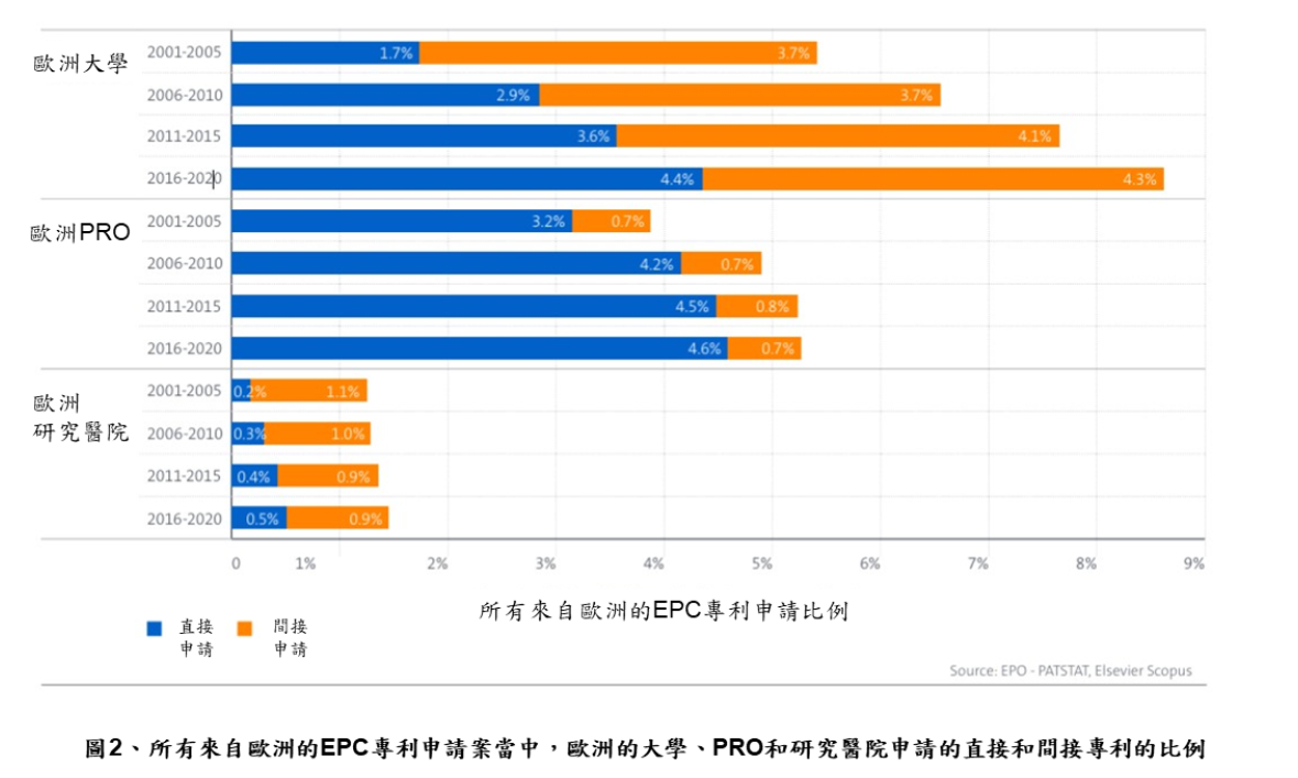 此份報告將專利申請模式分為以自身名義申請的「直接申請」,還有以第三方(企業或是合夥人)的名義申請的「間接申請」進行統計。圖2說明了歐洲的大學、PRO以及研究醫院的專利申請模式比例變化。大學在過去更傾向間接申請,直到近年,直接申請與間接申請的比例才趨於平均。PRO則是一直以直接申請為主,此申請策略可提高其研究結果的價值和商業化的機會。研究醫院在這20年間,直接申請的專利增加將近兩倍,但仍然以間接申請為主。另外,研究醫院主要申請的技術類型為藥物、生物技術和醫療技術與診斷。
