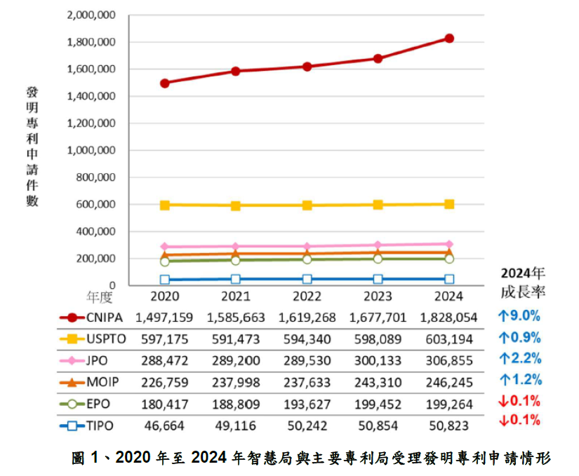 如圖1顯示,2024年,智慧局共受理50,823件發明專利申請案,至於五大專利局受理發明專利申請件數,以中國大陸國知局的1,828,054件最多,其次依序為美國專利局(603,194件)、日本專利局(306,855件)、韓國智慧財產權部 (MOIP)(246,245件)及歐洲專利局(199,264件)。