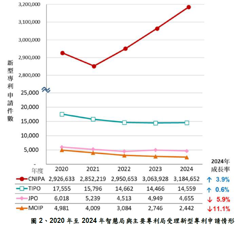 如圖2,智慧局於2024年受理14,559件新型專利申請案,但五大專利局以中國大陸國知局的表現最為亮眼(3,184,652件),其次依序分別為日本專利局(4,655件)及韓國智慧財產權部(2,442件)。