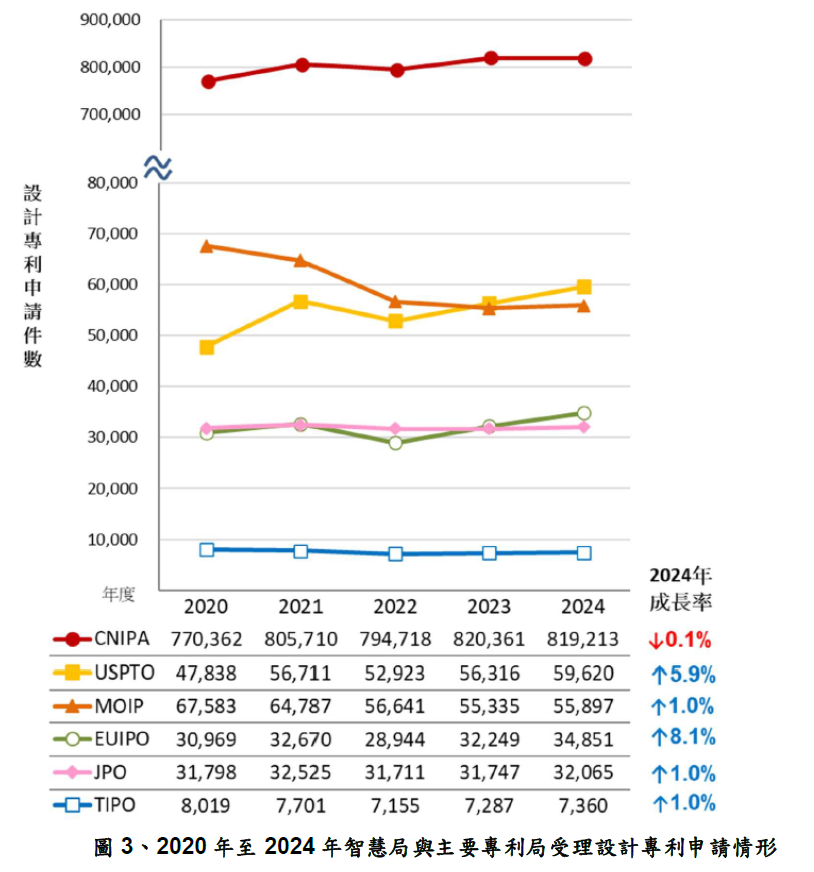 如圖3顯示,智慧局於2024 年受理7,360 件設計專利申請案,其他主要專利局中,以中國大陸國知局奪下首位,共受理819,213件,其次依序為美國專利局(59,620件)、韓國智慧財產權部(55,897件)、歐盟智慧財產局 (EUIPO)(34,851件)及日本專利局(32,065 件)。