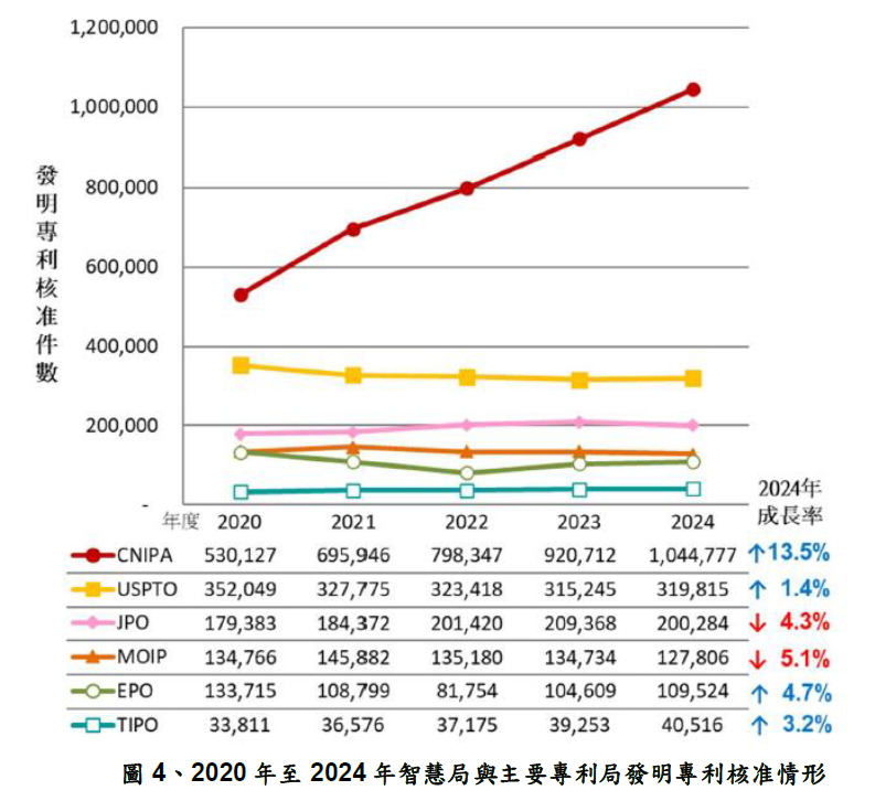 資料來源:2024年我國與美、日、歐、韓、中國大陸專利商標申請暨核准概況,智慧局,2025年11月24日。
