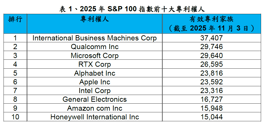 美國知名專利研究公司IFI CLAIMS Patent Services公布2025年的全球專利組合及美國專利相關之統計。表1為美國標準普爾100 (S&P 100) 指數成分股的公司所擁有的有效專利家族數量,表2為S&P 100指數中擁有專利組合最多的前十大專利權人,同樣是將專利權人子公司擁有的專利家族一併納入計算。