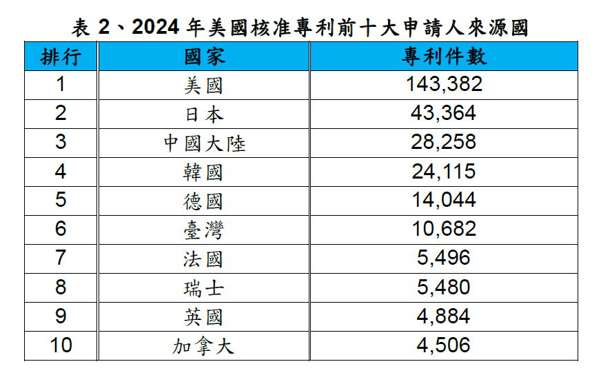 2024年美國專利局共受理430,625件發明專利申請案,核准發明專利324,043件。表2為2024年取得美國專利之前十大申請人來源國,其中臺灣排名第6名。