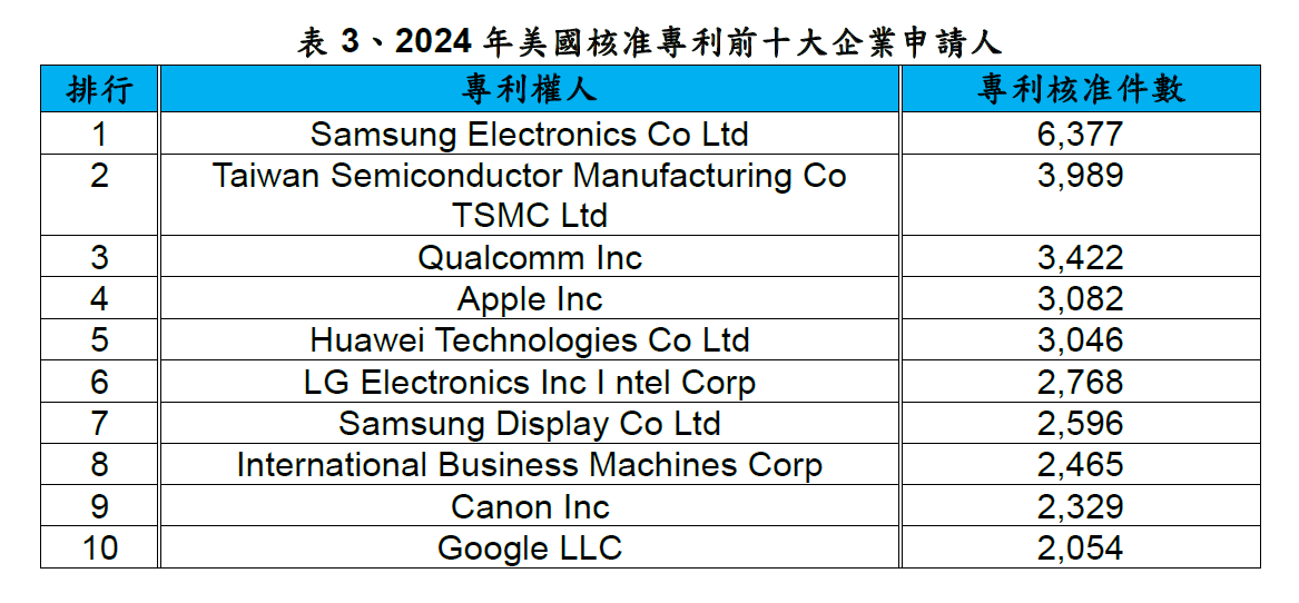 表3為2024年美國專利核准件數最多的前十大企業申請人,當中來自臺灣的台積電排名第2。