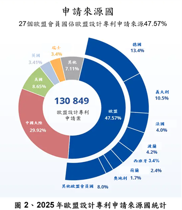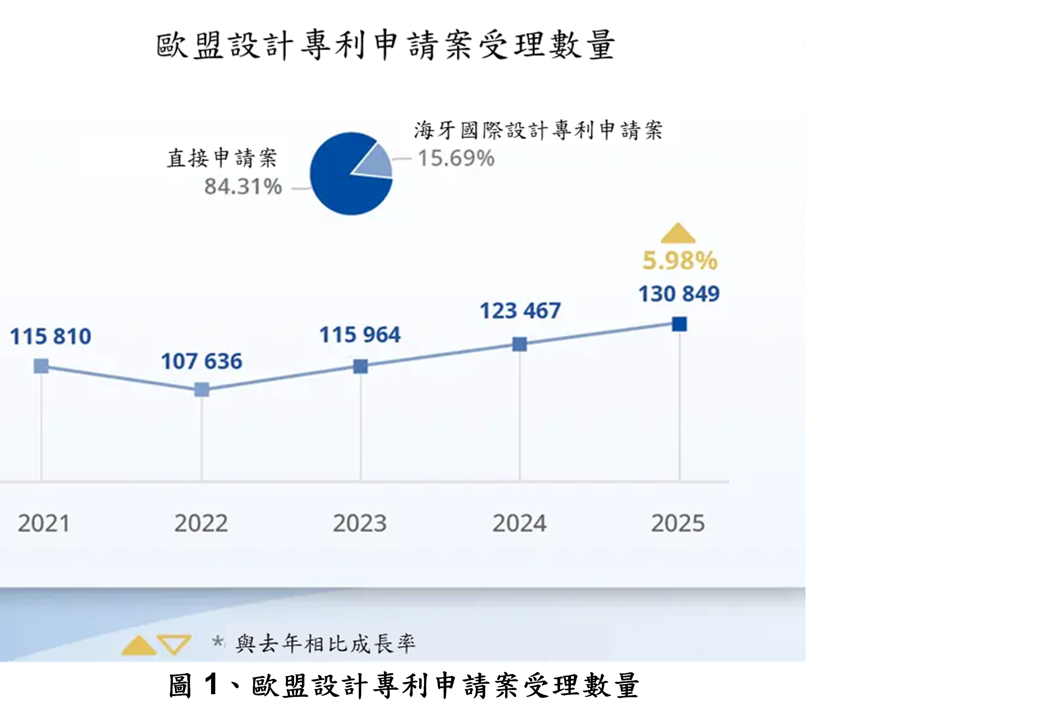 歐盟設計 (EU design) 專利在2025年總共受理130,849件申請案,如圖1所示,直接申請案佔約84%,海牙國際設計專利申請案佔約16%。申請案總數相較2024年成長將近6%,也是連續兩年呈現成長趨勢。