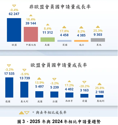 圖2顯示2025年的申請來源國。大約52%來自非歐盟會員國,48%來自歐盟會員國,這是首次非歐盟會員國大於歐盟會員國。