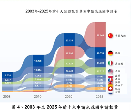 圖4為歐盟設計專利前十大申請人從2003年至2025年的申請量變化,由圖中可以看出中國大陸近五年的申請量大幅提升,成為主要申請來源國。