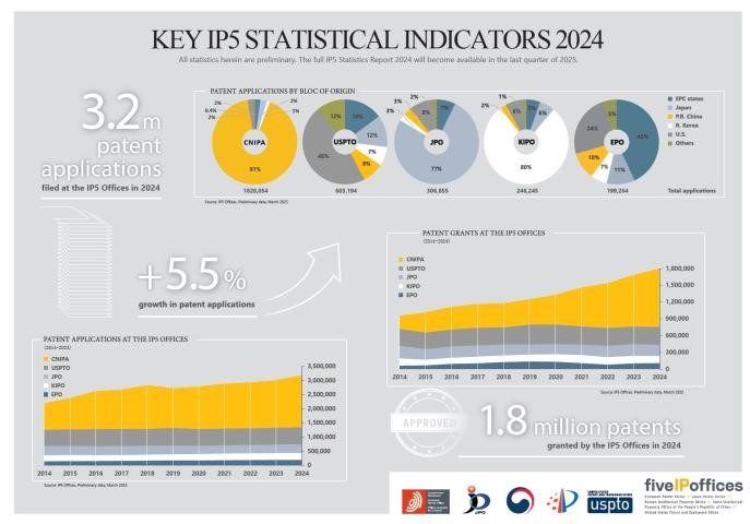 五大專利局 (IP5) 公布2024年統計數據,向IP5提出的專利申請案約有320萬件,與2023年相較增加5.5%。2024年IP5核准的專利超過180萬件,與2023年相較增加7%,如下圖顯示。